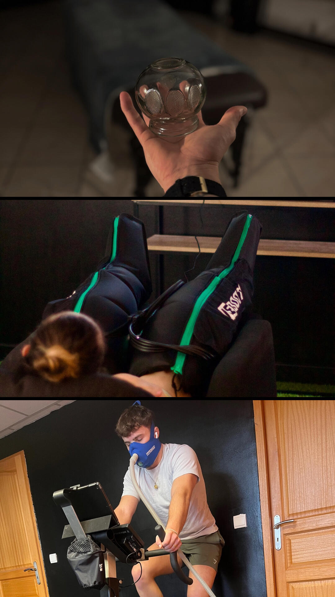 Ils sont là pour t’aider à mieux récupérer, relâcher en profondeur, ou relancer ce que ton corps ne fait plus naturellement.🔹 PressothérapiePour ceux qui ont les jambes lourdes, gonflées ou fatiguées.Des bottes à pression progressive qui stimulent la circulation et soulagent les jambes.